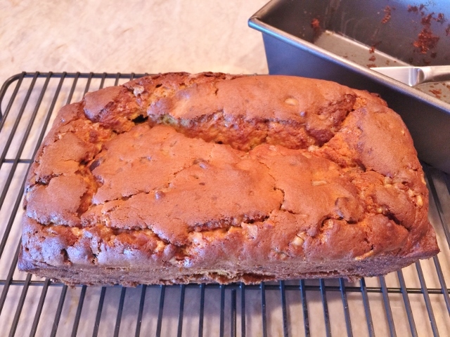 4. Spoon batter into prepared pan and smooth out on top. Place pan on sheet pan and bake for 1 – 1 hour 10 minutes, or until a toothpick comes clean. Remove bread from oven and let cool in pan for 20 minutes. With a table knife, loosen bread around perimeter and invert into rack to cool to room temperature. Slice bread and serve with your favorite beverage. Enjoy!