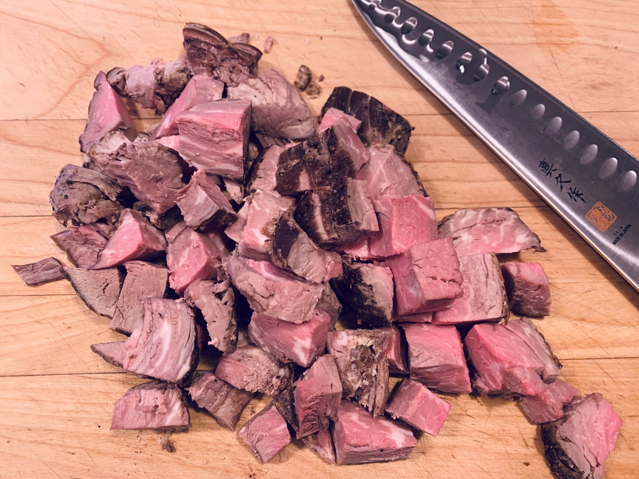 After the holidays the leftovers can be abundant. I usually cook beef on Christmas day, not a rib roast, but a tenderloin. Beef Tenderloin is buttery and it melts in your mouth, and I know it’s on the expensive side, so I like to utilize the entire roast, even the next day. This year I prepared a tomato beef and greens soup – simple, satisfying and delicious.
