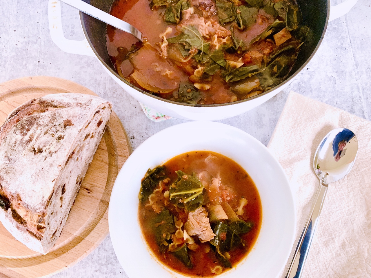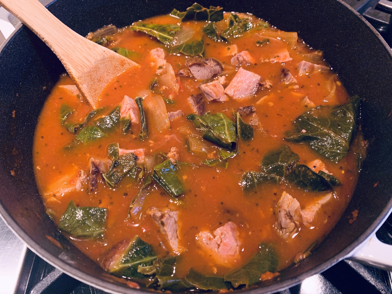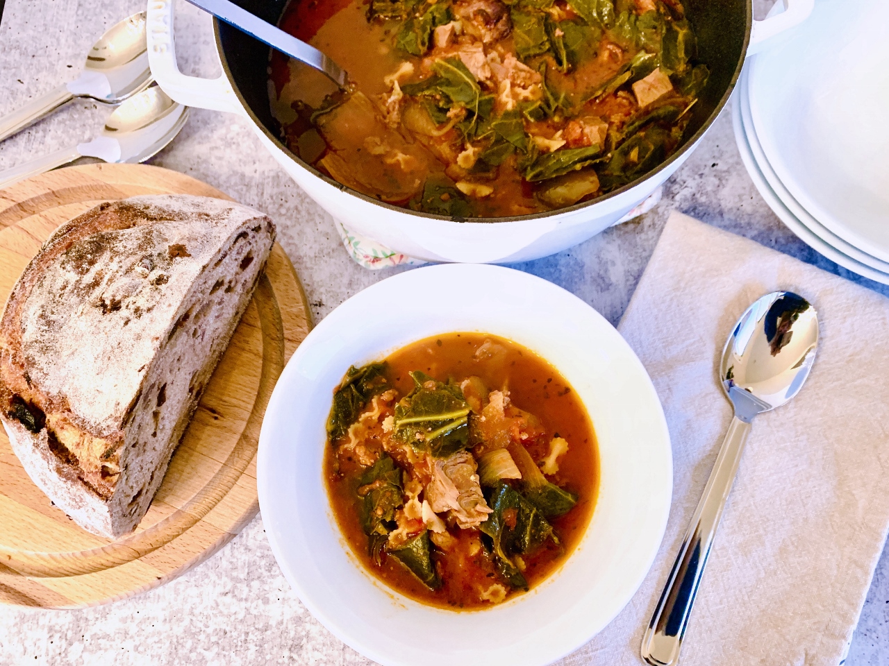 I decided to make this hardy pot of soup with the remaining slices of beef. Soup is always a favorite and anything that you can add to a pot of broth, makes mealtime deliciously easy. Preparing a beef soup in a tomato base with greens is as simple as I can be, and what makes it fun is adding other leftover or pantry items like potatoes, dried pasta or roasted vegetables, for a medley of flavors.