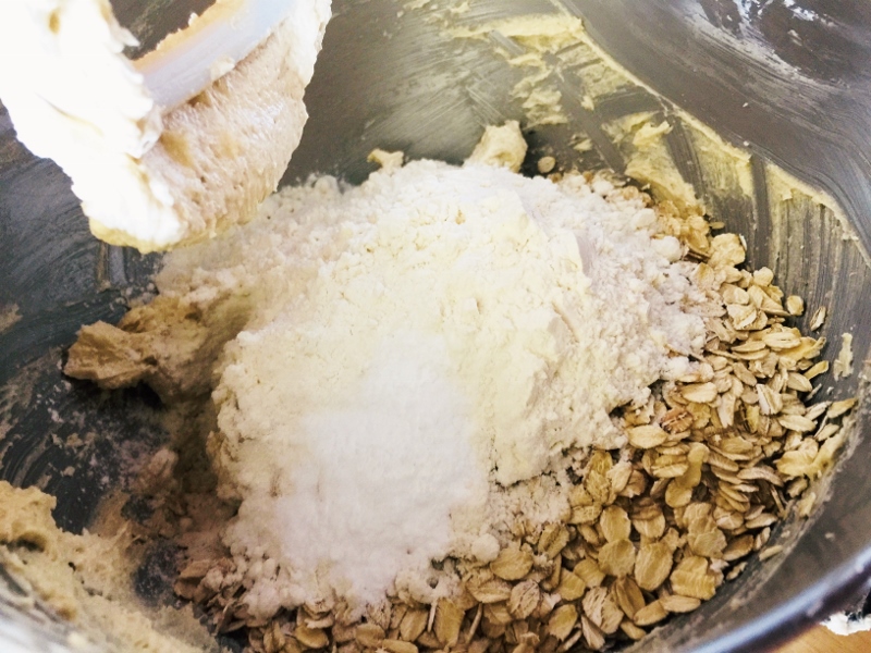 2. Add flour, oats, baking soda and salt, mix on low for 1 minute. Add trail mix and chocolate, mix for 30 seconds.
