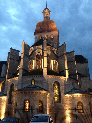 After unpacking our bags we headed to Beaune for dinner at Le P’tit Paradis. Heading into Beaune there in a main circle road the surrounds the city and you can park on the outside of the circle or venture inside to try and find parking. We were lucky enough to find a spot on the backside of the Basilica Collegiale Notre Dame de Beaune and were amazed at its beauty at night.