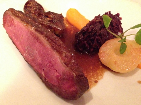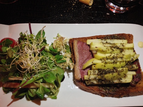 The restaurant was small and the tables fairly close together and the waitress was very friendly and prompt. I started with an appetizer of Pain d’ Epices (loosely translated as gingerbread, but it tastes more like spice bread) with Sliced Smoked Duck Breast and chopped apples and a small salad. The flavors of the bread made the smokey duck have a hint of sweetness and I loved the crunch from the apples.