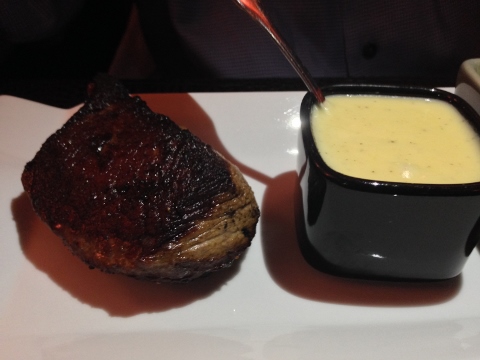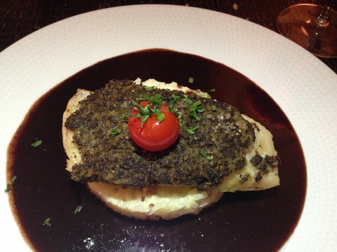 For our main course we had Mushroom Crusted Cod in a deep Red Wine Sauce and Seared Steak with more Cheese Sauce.