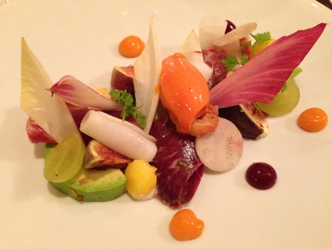 That evening we went to L’ Ecusson for dinner in Beaune. The restaurant was in a small hotel at the end of the street and the atmosphere was warm. I began with a salad of Iberico Ham, Avocado, Grapes, Red Pepper Sorbet and Assorted Pickled Veggies. The salad was the prettiest thing I’ve eaten in a while.