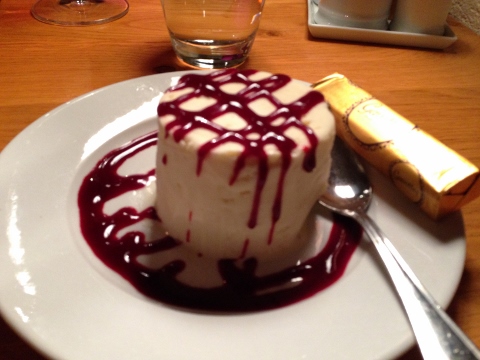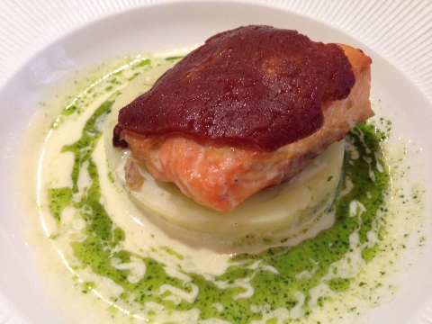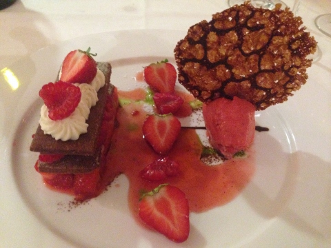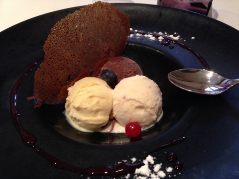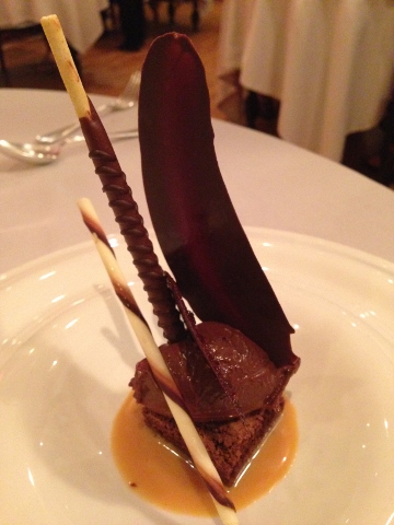 Our main courses were Salmon with L’ Epices Crust over mashed potatoes and parsley oil and Lamb Two-Ways. The salmon was my favorite fish dish of the trip – simple, but delicious. The lamb was prepared in a stew and a seared loin, needed a little salt.