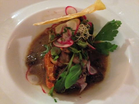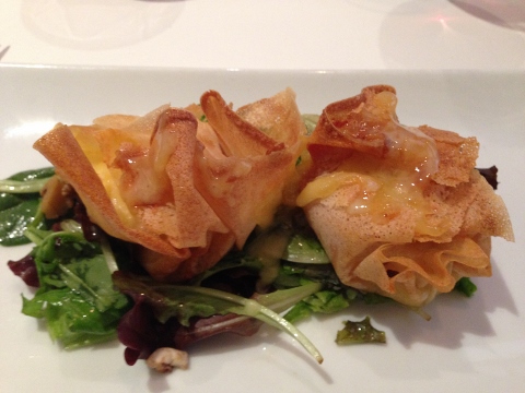 The cheese course was small pieces of Epoisses wrapped in Phyllo on top of salad. I thought the presentation over salad was great and I loved the light crunch.