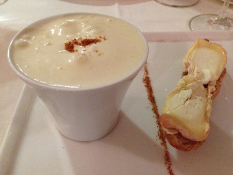 That evening we had dinner in Pommard where we were staying and had heard that Aupres du Clocher had a wonderful chef. We started with an amuse bouche of Cold Langoustine Bique with a dollop of fresh whipped goat cheese. I thought the flavors were intense and I hadn’t had cold seafood bisque before.