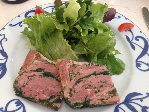 After a few hours of in-class instruction, we headed out for lunch at Auberge St. Martin in Bouilland. The chef was very friendly and we exchanged conversation through Lynne. We started with Jambon Persille, a local dish which is pressed Ham with fresh Parsley served with a side salad.