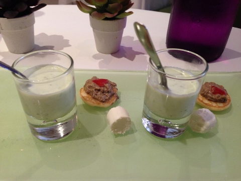 On our last day we visited the village of Santenay and walked up the hill to the Chateau. We had lunch on the square at Le Terroir and it began with a light amuse bouche of Goat Cheese, Cep on Pancake and Yogurt Soup with Herbs.