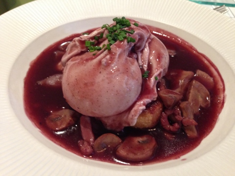 For a starter, I had Prawns with Tomatoes with a Shrimp Panna Cotta and my husband enjoyed Eggs Meurette (eggs in red wine sauce.)
