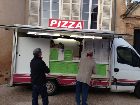 That evening the pizza truck arrived in Pommard, so we decided to buy a pizza in France. The pies are baked in a pizza oven on the truck. It had a brioche crust with mushrooms, lardons, parmesan and creme fraiche…..so fun!
