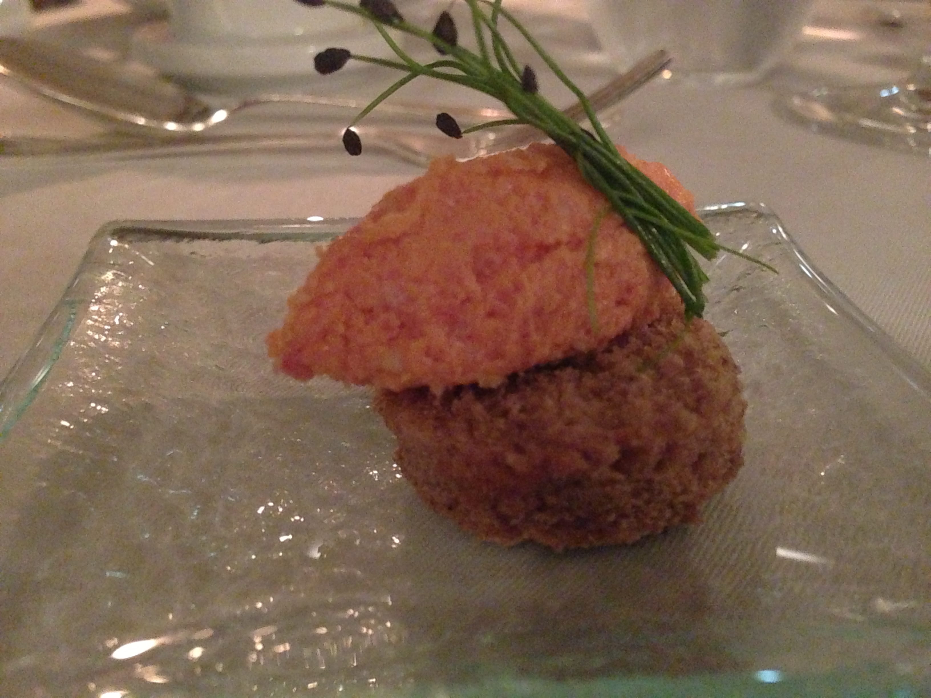 We had a cocktail in the lounge ahead of time, we were on an Irish Whiskey Exploration so to speak. We ordered our meals in the lounge and when we were seated the meal began. It started with a Chorizo and Cream Potato Crisp amuse bouche that was satisfying to say the least.