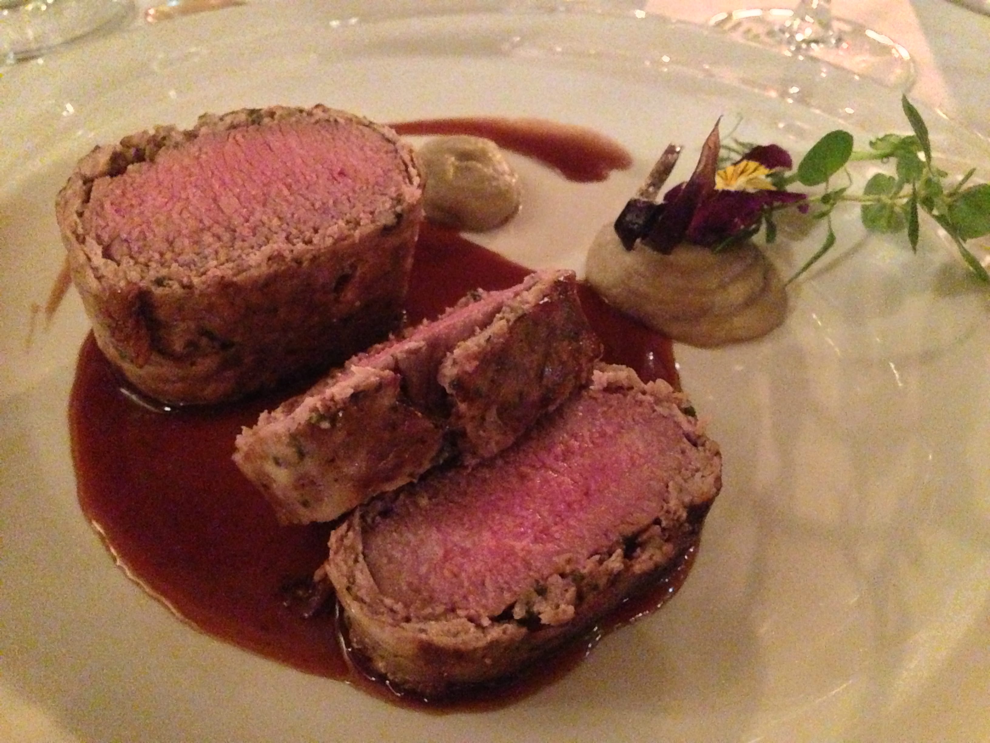 Lamb crusted with dried herbs was another great dish. The herbs tasted as if coriander was in the rub and it gave it a nice fragrance. The meat cooked perfectly and served with a puree of eggplant. A side of whipped potatoes and skewered grilled veggies were also placed on our table to accompany our meals. Everything was absolutely fantastic. One of the best meals of the trip.
