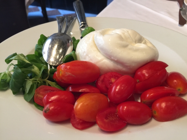 The next day we headed to a cafe for lunch that was recommended by our concierge, Il Salumaio.  The cafe was located in a courtyard by the fashion district and it was filled with local business people and models.  The waitstaff spoke English, which was helpful and the food was nice.  To start, we shared a plate of Burrata, Watercress with Cherry Tomatoes and I must say, the portion was huge, but incredibly fresh.  It is definitely a challenge in the states to find mozzarella this good.