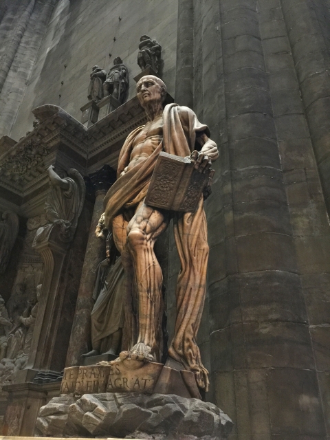 This statue of St. Bartholomew with his own skin wrapped around his neck was created by a sculptor named, Marco d’ Agrate.  The Cathedral is loaded with amazing pieces of art that are only found here in Milan.