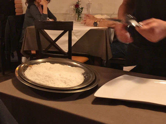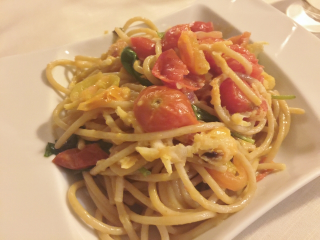 Our next course of Spaghetti with fresh Tomato & Basil with Grana Padano was prepared tableside inside of the cheese round.  Check out this video of how she prepared it!