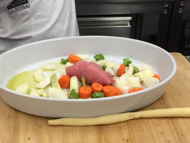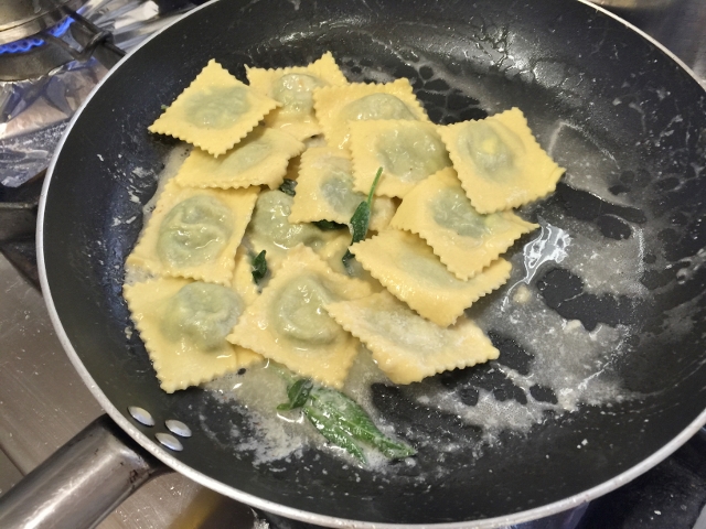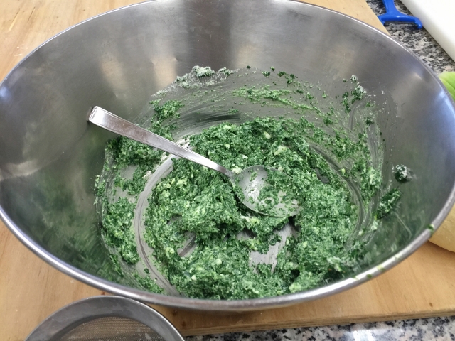 Chef Davide and I really hit it off.  He had opened restaurants in the United States and has an uncle who lives in Los Angeles.  We started off my making the fillings for the pastas – the veal and vegetables went into the oven to roast, while we ground the spinach for the ravioli.