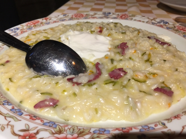 We made it back in time for dinner at a local ristorante not far from our hotel called, Il Tavolino.  The place was packed with guests, but the service was friendly and fast.  We had a delicious Risotto with Prosciutto & Squash Blossoms and the best Veal Milanese of my life.