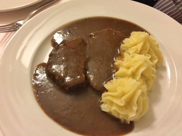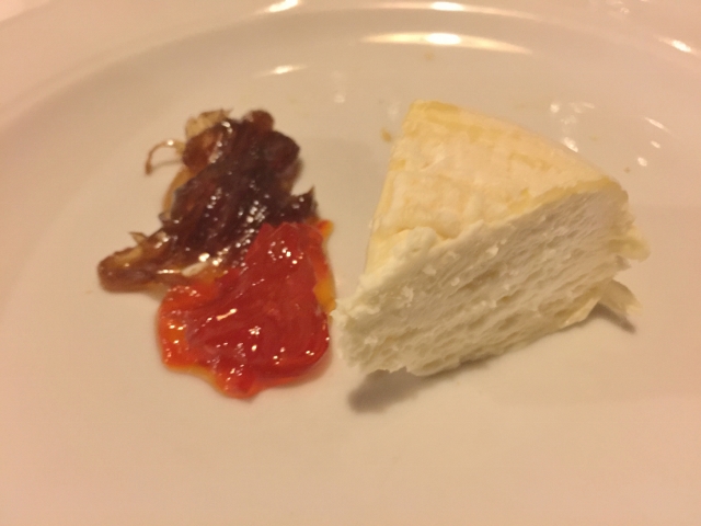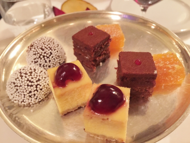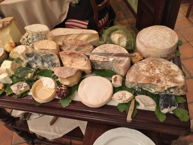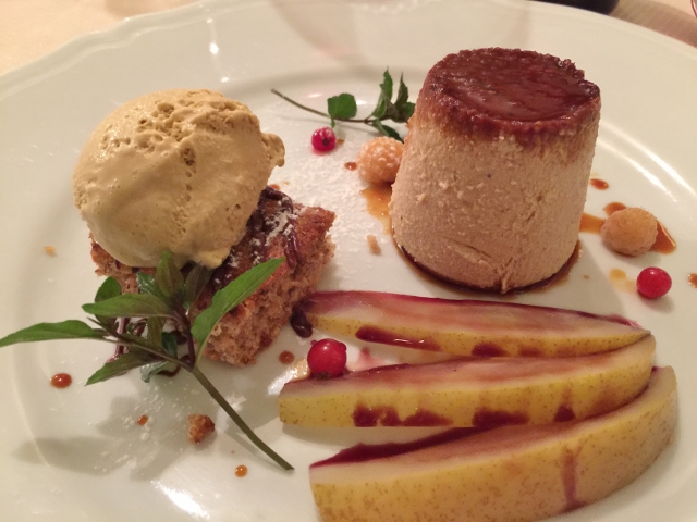 The cheese cart and dessert came next. Â The selection of cheeses was magical and the dessert was probably the best of the entire trip – Hazelnut Cake with Coffee Ice Cream and a Milk Chocolate Bombe with Poached Pears.