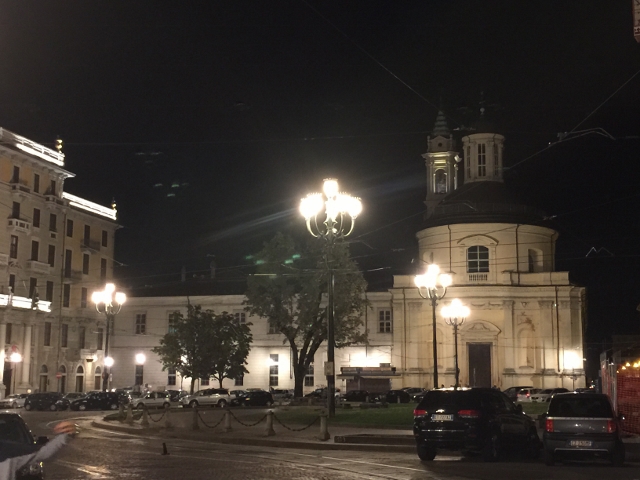 For dessert, we had Gianduja on Puff Pastry Crust drizzled with Chocolate Sauce, sort of the Mille Feuille of Italy — decadent. Â We walked back from dinner through the streets of Turin admiring all the lovely piazzas and buildings.