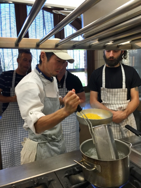 We cleaned up for dinner and had a quick cooking lesson with the Chef at Villa Tiboldi. Â He demonstrated how to prepare Tajarin Pasta, which is a tagliatelle pasta made with a dozen egg yolks per batch. Â The bright yellow hue is due to the high concentration of yolks and is served with meat sauce or the more traditional butter and sage sauce.