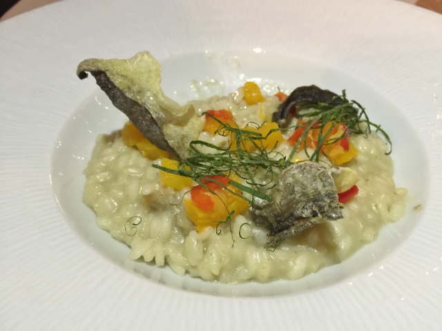 The Risotto with Eel and Roasted Peppers with a hint of Ginger was the most interesting dish of the night. Â The crunchy tempura on top of a bed of creamy rice had nice contrasting textures. Â We enjoyed another Malvira’ wine with dinner.