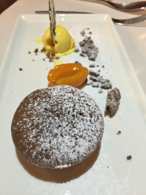 For dessert, an airy Chocolate Cake with poached Apricot and Custard Gelato with a glass of Grappa. The perfect ending of our first day. Â Delightful!