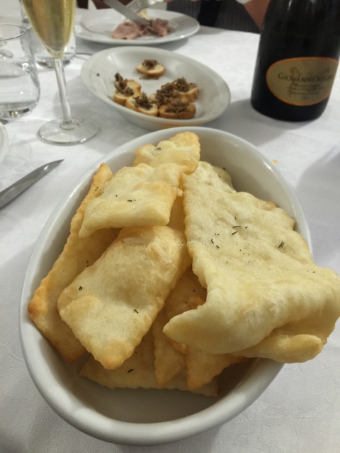 Dinner was at a local Agriturismo in Canale. Â Breadsticks are at every table in Piedmont, not to mention local white bread and tonight fried bread too! Â The fried bread, when it was hot, reminded me of a beignet without the powdered sugar…this is not the place to eat low-carb. Â Â Â