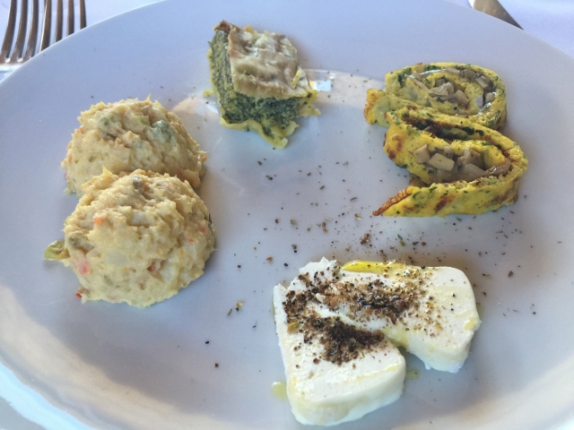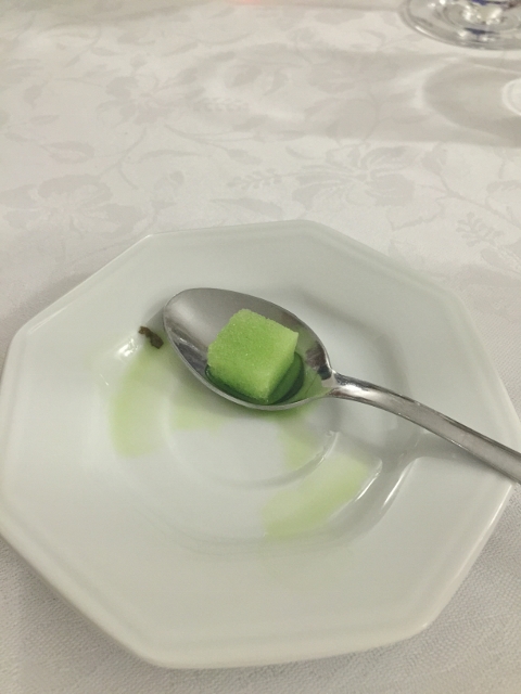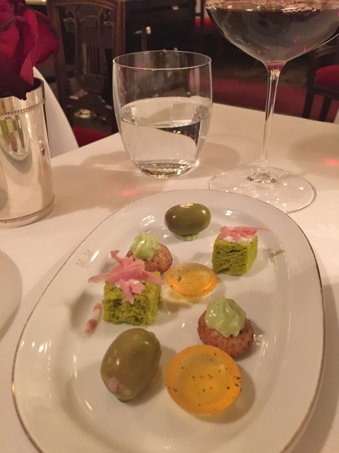 As for the food, well … it definitely could use an update, but what did we except. Â The Aperitivo plate had Jellies, Olives Stuffed with Foie Gras, Mini Muffin with Avocado Sauce and Verde Cake with Pickled Onions.