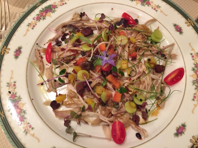 At Villa Tiboldi, we were seated in the dining room of the restaurant for dinner on a large oval shaped table. Â We started with some more delicious wine from Malvira’ Winery, who owns Villa Tiboldi.