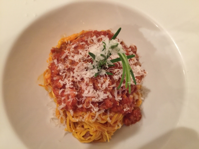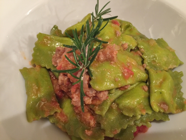 The Pasta course was next and we ordered three dishes to share – Gnocchi with Shellfish, Spinach & Goat Cheese Ravioli with Sausage and Dan’s favorite – Tagliatelle Bolognese. Â As a group we enjoyed the ravioli and tagliatelle best.