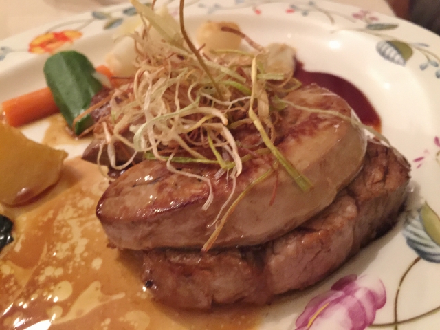 After pasta were our entrees of Veal Tenderloin with Foie Gras. Â We ordered two plates to share and as you can see, the size of the lobes of Foie were as big as the steak — huge!