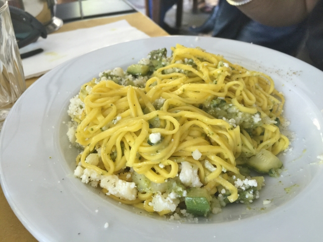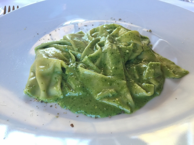 Here’s where the meal goes crazy delicious — Our second course was Mandilli with Pesto made with basil from Pra, a town known for growing the best and parmesan from Liguria. Â The ribbon pasta was light and delicate with a sauce that was slightly sweet and earthy all at the same time. Â Fantastic!
