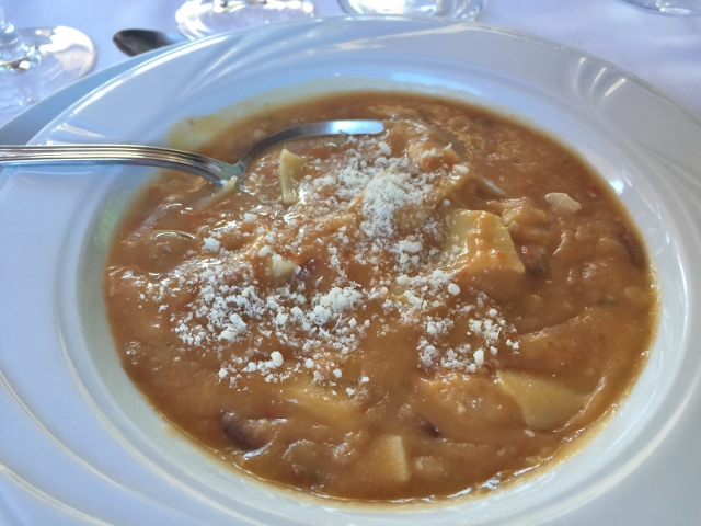 Our entree of Pasta e Fagioli made with the same ribbons of pasta, cut up and folded into a broth of Borlotti beans. Â I loved this dish just as much as the pasta above.