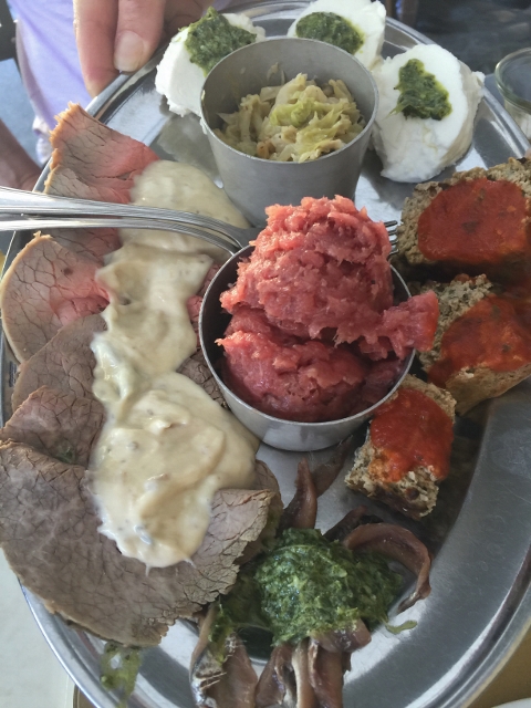 After coffee, we went to lunch a few steps away from Piazza Castello at Da Cianci Piola Caffe’. Â The small restaurant was mostly seated outside with a few tables inside close to the bar. Â The menu was concise with just a few offerings during lunch. Â We started with a sampling of all the appetizers including: Mushroom Flan with Tomato Sauce, Goat Cheese with Pesto, Warm Cabbage Bagna Cauda, Anchovies with Salsa Verde, Beef Tartar and of course Vitello Tonnato.