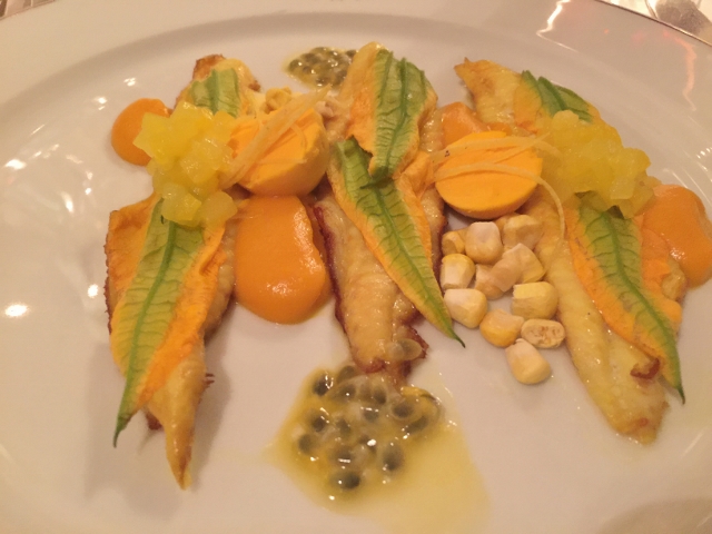 The traditional Agnolotti with Beef Sauce was nicely done, but we had already eaten our share. Â My entree was Sole with thick Egg Custard Puree and Zucchini Blossoms. Â It was the brightest plate I had ever seen, but not the tastiest.