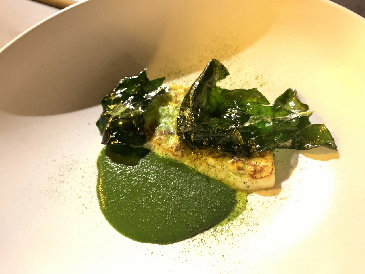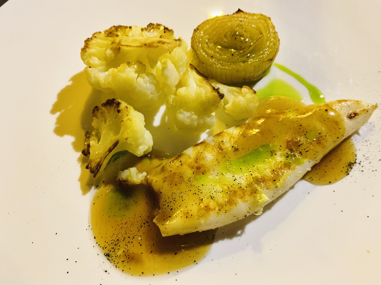 Our dinner that evening back at Mandranova Olive Estate, and we began with Seared Sheep’s Cheese in a SpinachSauce with Fried Spinach Leaves.  Followed by broken noodle Garbanzo Bean Pasta and Calamari with Roasted Onion and Cauliflower and a drizzle of estate oil.
