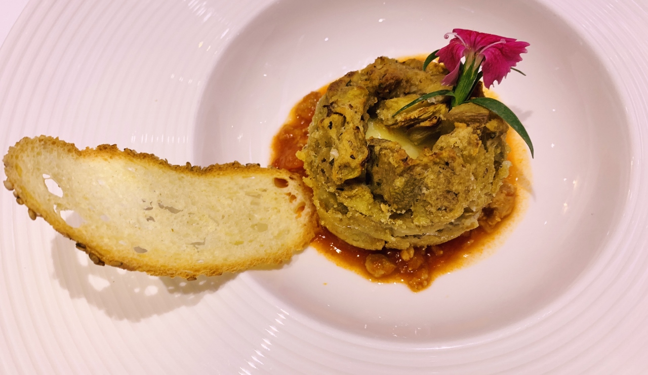 Cocktails before dinner in Agrigento were at Enoteca Nzolia, on the patio below Ristorante Kalos – where our reservations were this evening.  At Kalos, we each chose the tasting menu – the women, seafood menu and the men, meat menu.  The dishes that stood out in my mind were the Swordfish Crudo with Burrata cheese and the crispy Artichoke Heart on a bed or Beef Ragu.  Both unique in preparation and the flavors extraordinary.  I liked the fact that true culinary rules didn’t apply in this chef’s mind – cheese with seafood is a definite plus and let’s face it, Meat Ragu makes every vegetable taste better (according to my husband).