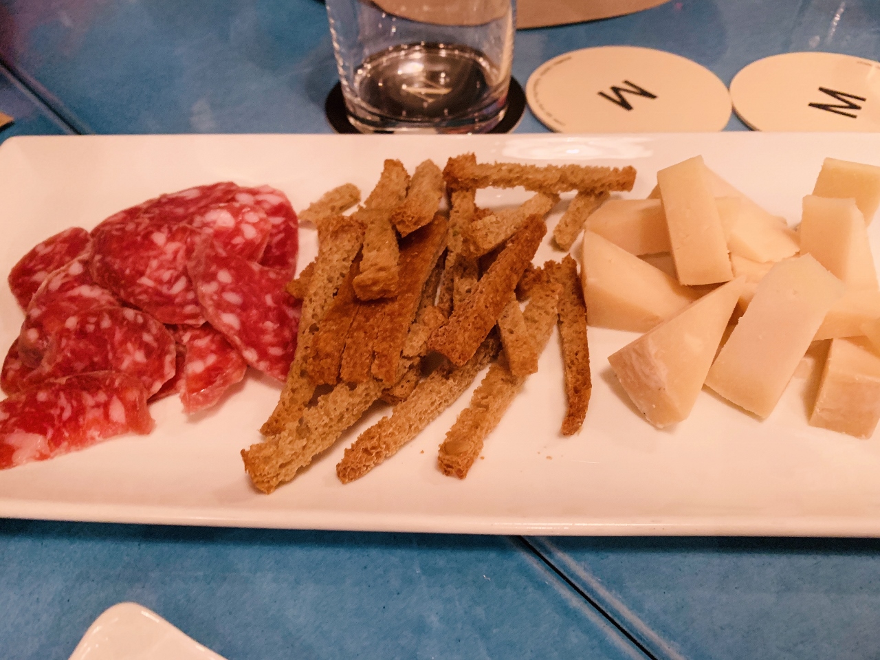 We began our downtown Noto visit by touring around the streets and Cathedral, while waiting for our dinner reservation.  Our meal was at La Manna in a small building, just up from Cafe Sicilia (famous granita cafe on Netflix) with rustic, traditional Sicilian cuisine.  While waiting, we enjoyed red wine, which we sipped at our table once seated, along with chunks of Pecorino, salami and toasted bread sticks.