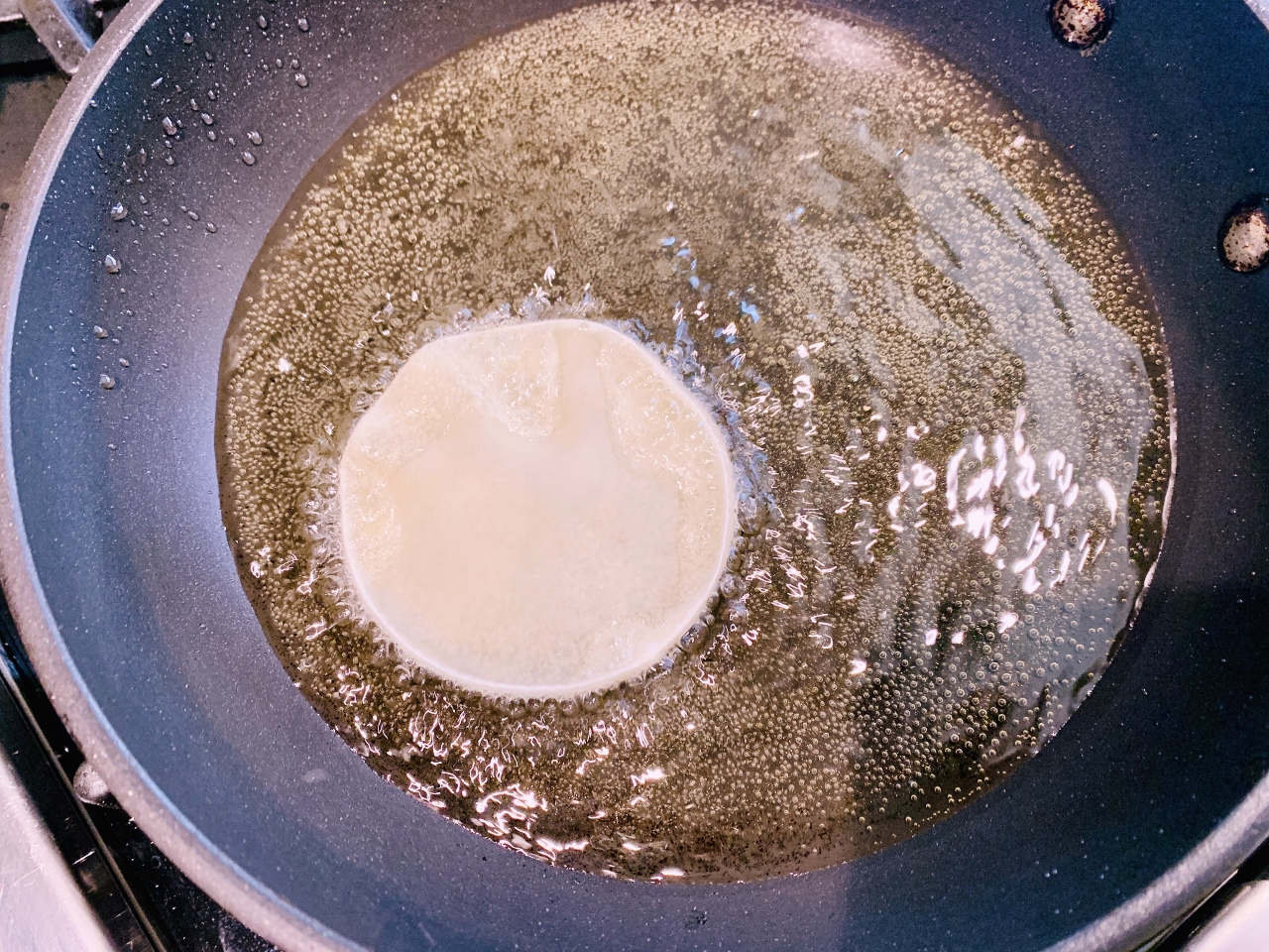 - Frying wontons in oil over medium-high heat until crispy brown. Drain and snap into two pieces.