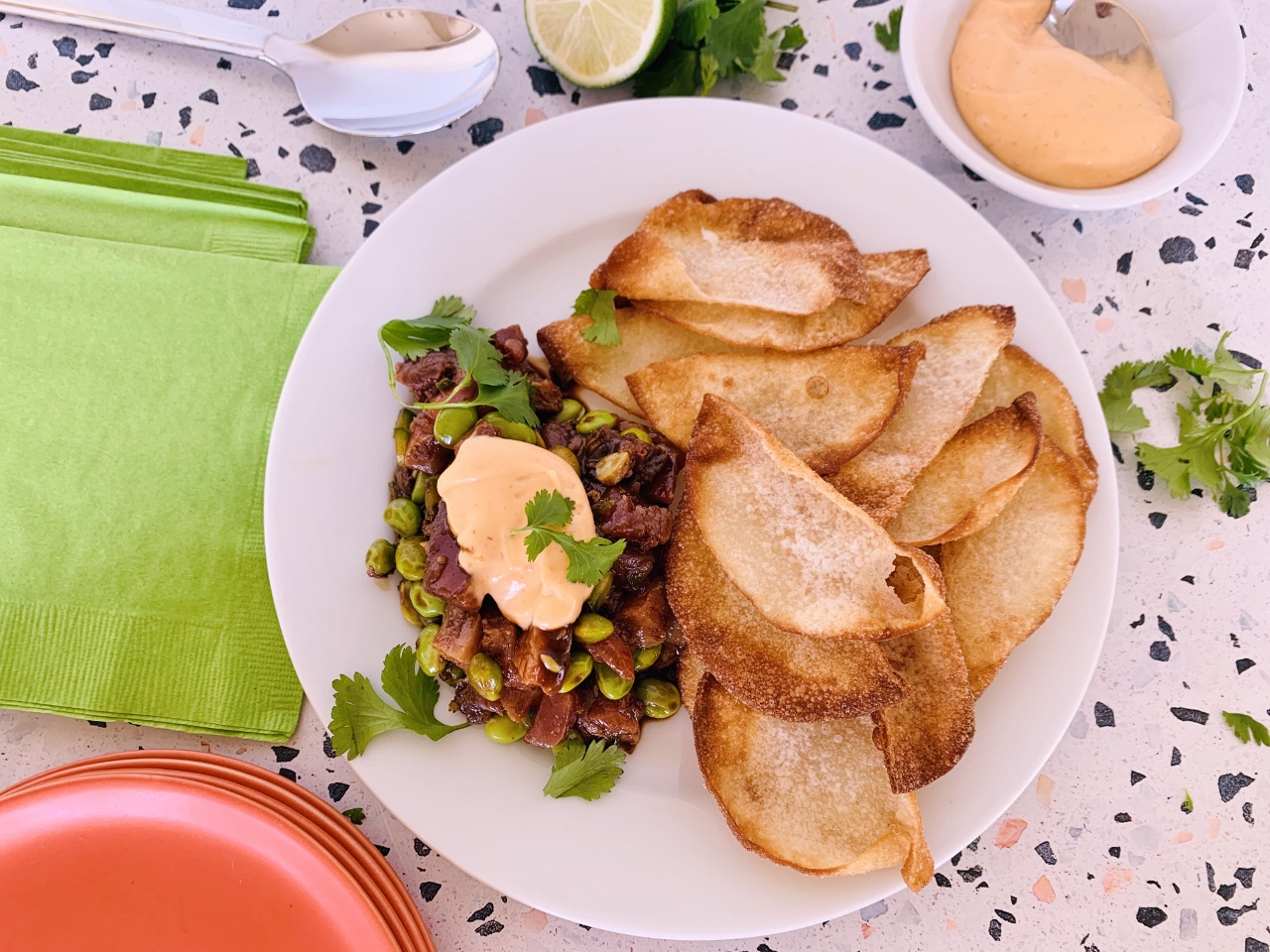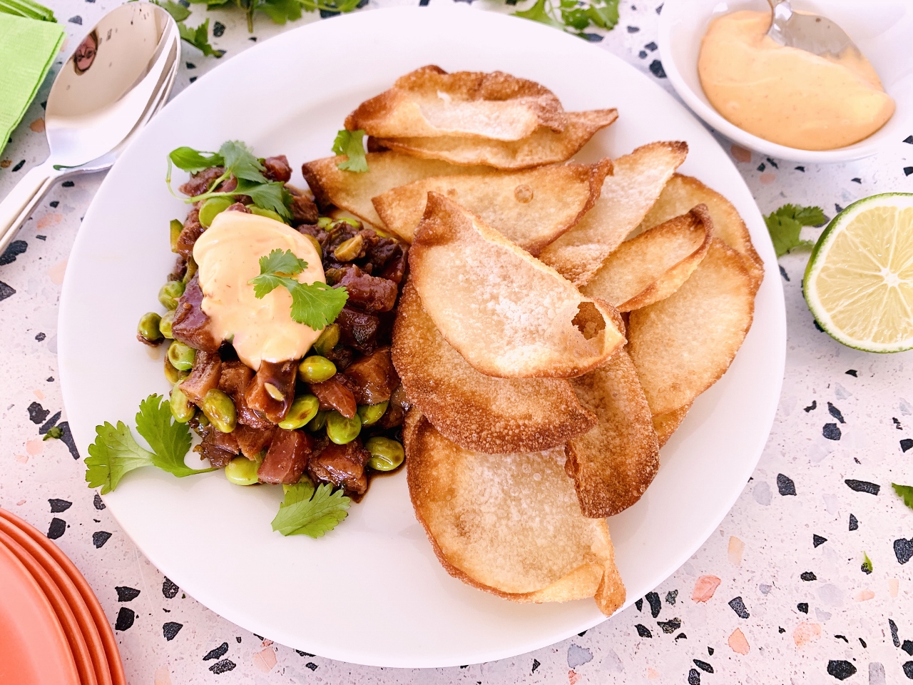 - Place tartar on a serving plate and dollop with mayo and serve with wontons. Enjoy!