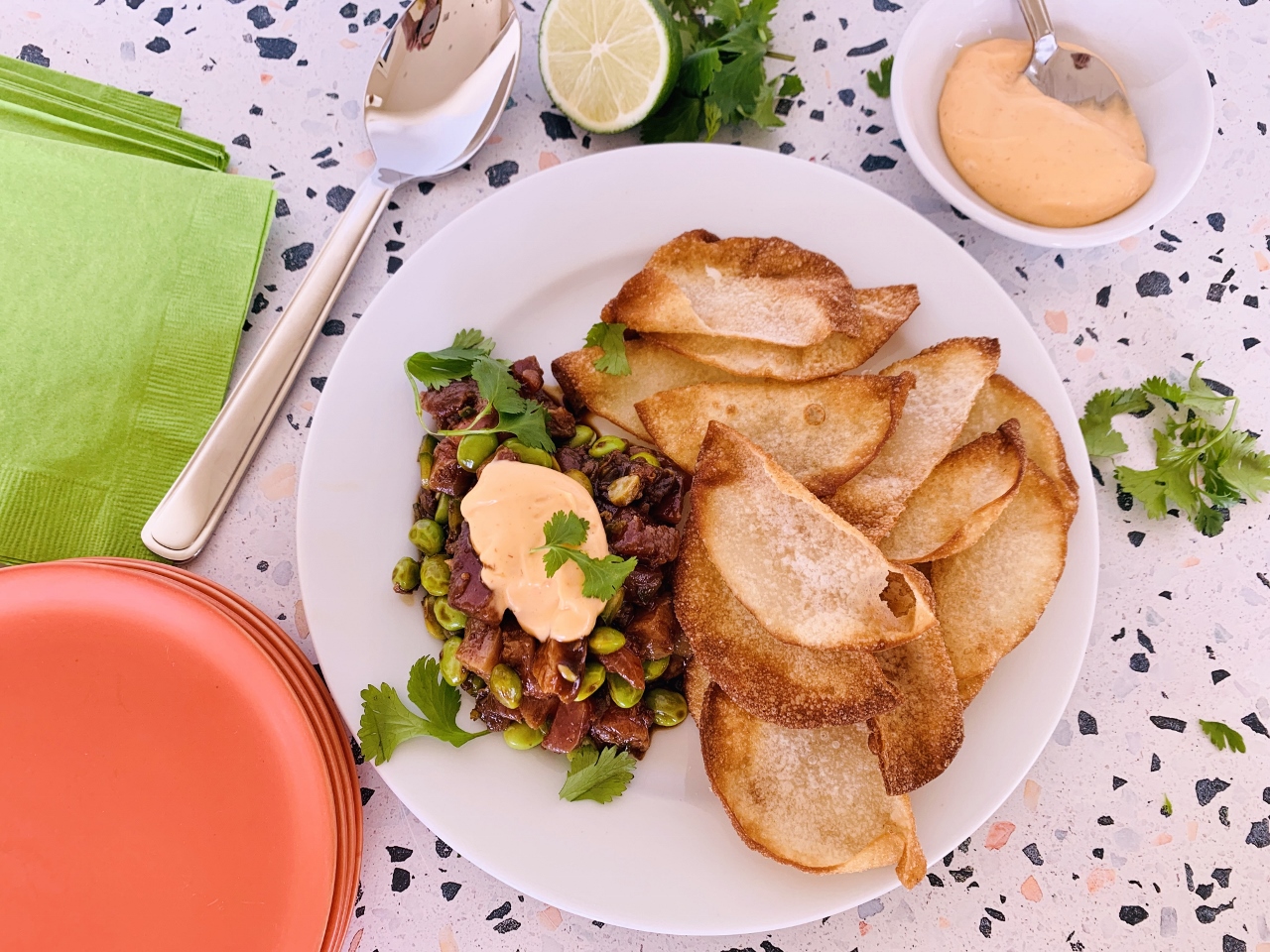 - Place tartar on a serving plate and dollop with mayo and serve with wontons. Enjoy!