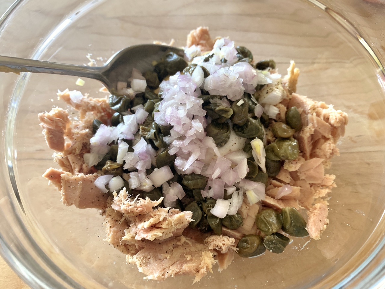 2. In a bowl, add tuna, 2 tablespoons mayonnaise, Dijon, shallots, capers and a pinch of salt and pepper.  Stir until creamy and combined.