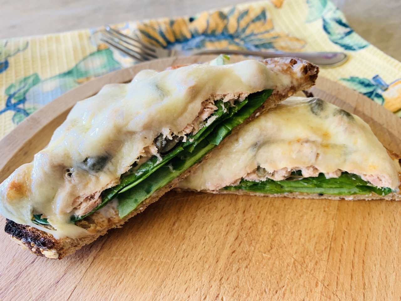 Tuna whether oil or water packed is always available in most people’s pantries and can be transformed into all sorts of wonderful things, especially a hot sandwich.   I buy oil packed tuna because who wants to eat waterlogged fish?  Not me.  So, any variety of tuna, preferably not albacore because it has shown to have a bit of mercury, but if you don’t eat tuna everyday, I don’t think it matters much.