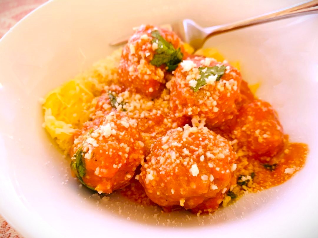 Meatballs are true comfort food and it’s the one meal I think I can eat on repeat quite frequently. I have a few meatball recipes here on my blog, but this one I make with ground turkey, and poach them in Vodka Sauce. If you aren’t familiar with this type of sauce, it’s basically a splash of vodka and cream added to tomato sauce to create a lightly sweetened pinkish colored bath for your meatballs to cook. This particular sauce would probably be considered old-school, but is being revisited in many different recipes on social media these days. The alcohol mostly cooks out, and you are left with some of the tastiest sauce in town. I like to serve these balls over spaghetti squash, or pasta for one fantastic meal anytime during the week.
