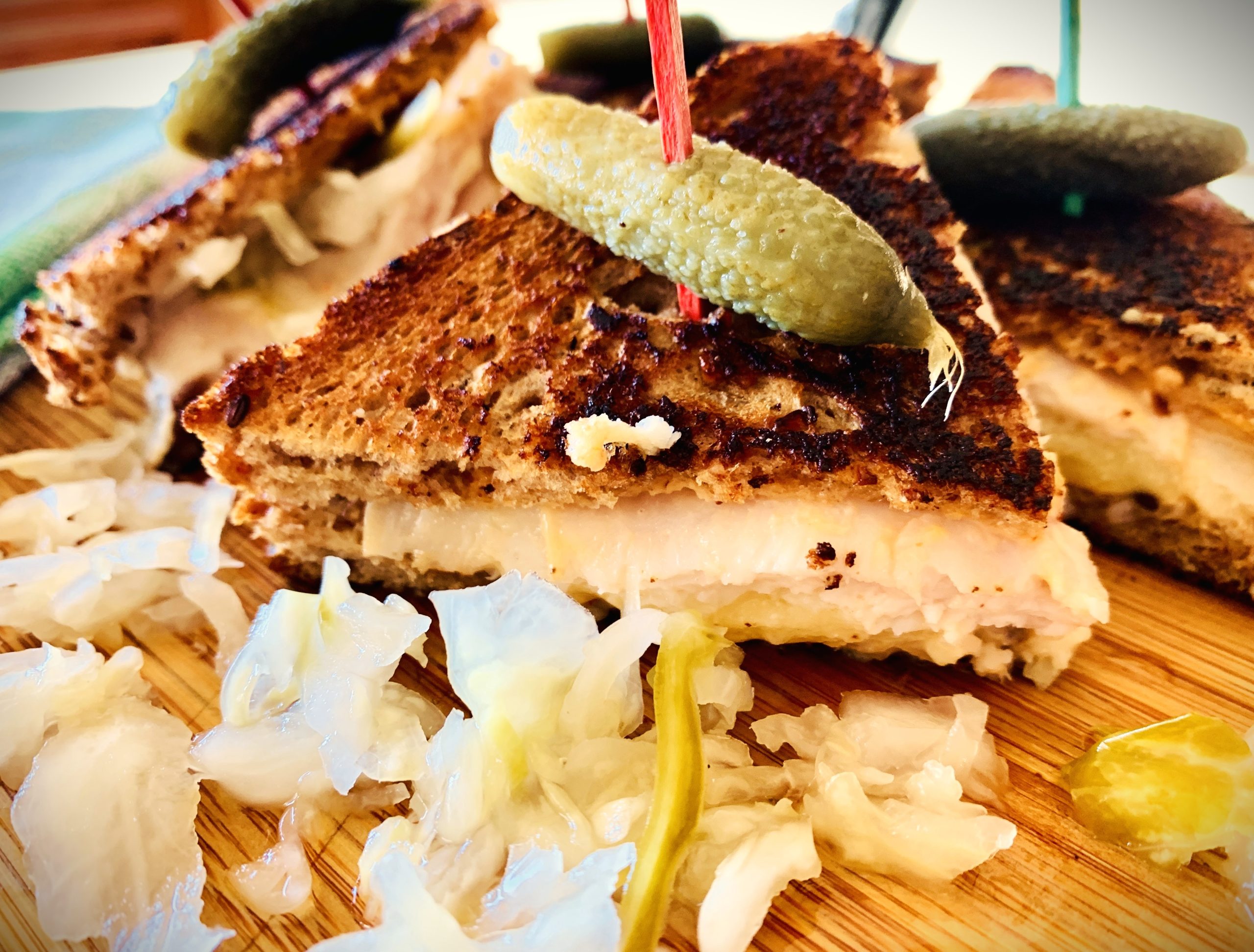 I think this makes a great dinner or lunch, and it’s great for dipping into your favorite soup or serve with homemade fries. The warm crispy bread with tender turkey and softened cheese with a briny kraut makes everything so delightfully good.