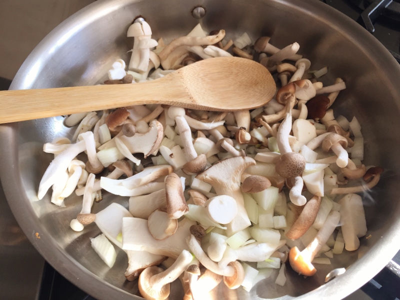 1. Prepare pasta or spaghetti squash as directed, set aside. In a large sauté pan, add 1 tablespoon olive oil and place over medium heat. Add diced onion, mushrooms and garlic and sauté for 6 minutes. Add dried thyme and stir.
