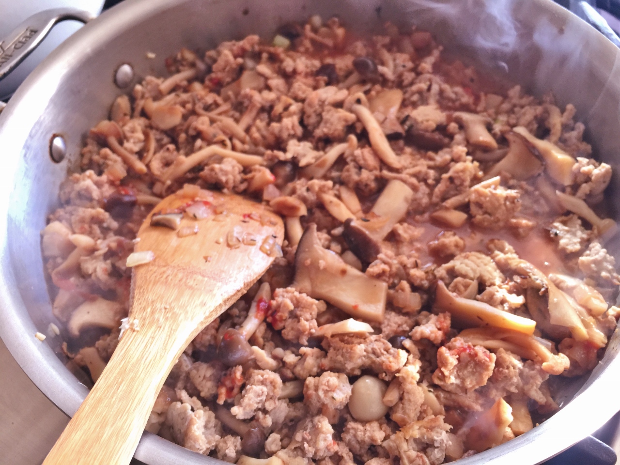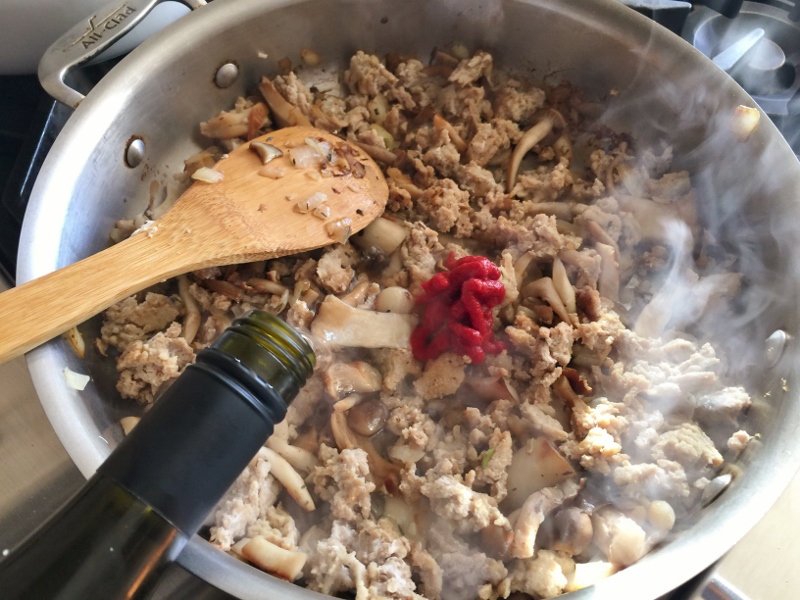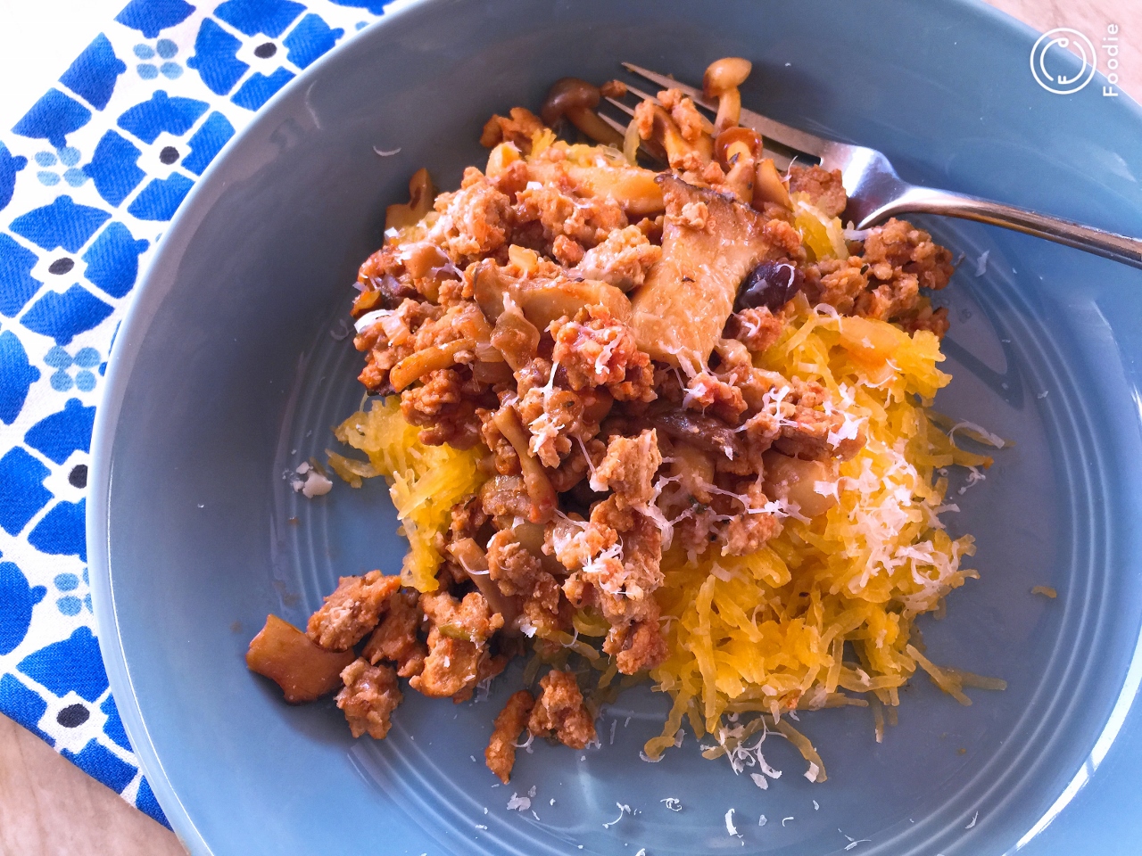 Turkey has always been a great substitute for ground beef or pork and today, there are so many varieties to choose from, so you can mix both light and dark poultry to make a well rounded sauce with tremendous taste. I decided to add some wild mushrooms into the mix because they add earthy flavor that works really well in this recipe. Wild mushrooms like oyster, shiitake, crimini or maitake vary in taste, so choose mushrooms you enjoy cooking and eating. To complete the sauce, a little tomato paste, white wine and chicken broth round out the flavors, and add a magnificent balance that’s delicious with pasta or spaghetti squash.