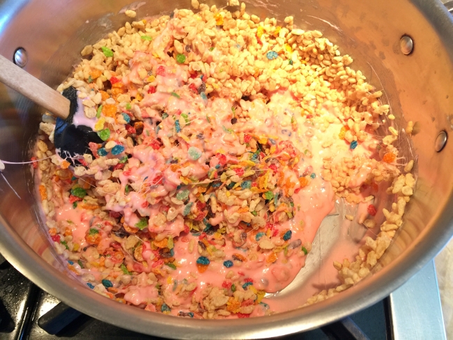 3. Moving quickly so the Rice Krispies treats don’t set, spoon mixture into the prepared pan.