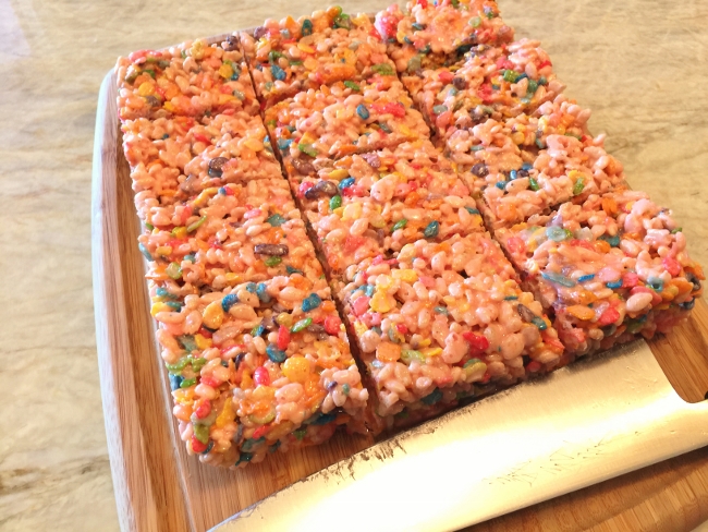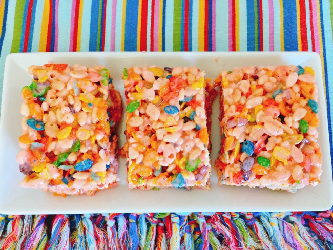 Snatch up a bag of large marshmallows and add some fruity cereal, along with Rice Krispies to make Tutti Frutti Rice Krispies Treats.These fruity flecked creamy treats are so fun to slice up for the summer and serve at parties, picnics or as a snack or dessert. Kids and adults will both love them.